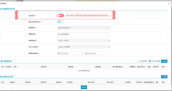 6. 课题组注册申请完成后,由课题组负责人所在学院相关审批人(审批人信息在“是否启用”栏目处有提示信息)进行课题组审批,完成审批后该课题组启用。