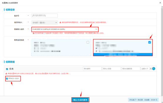 5. 在“批量确认生成结算单”界面,选择“机组收入项目”—“项目卡号”—“单号”,点击下方“确认生成结算单” 。