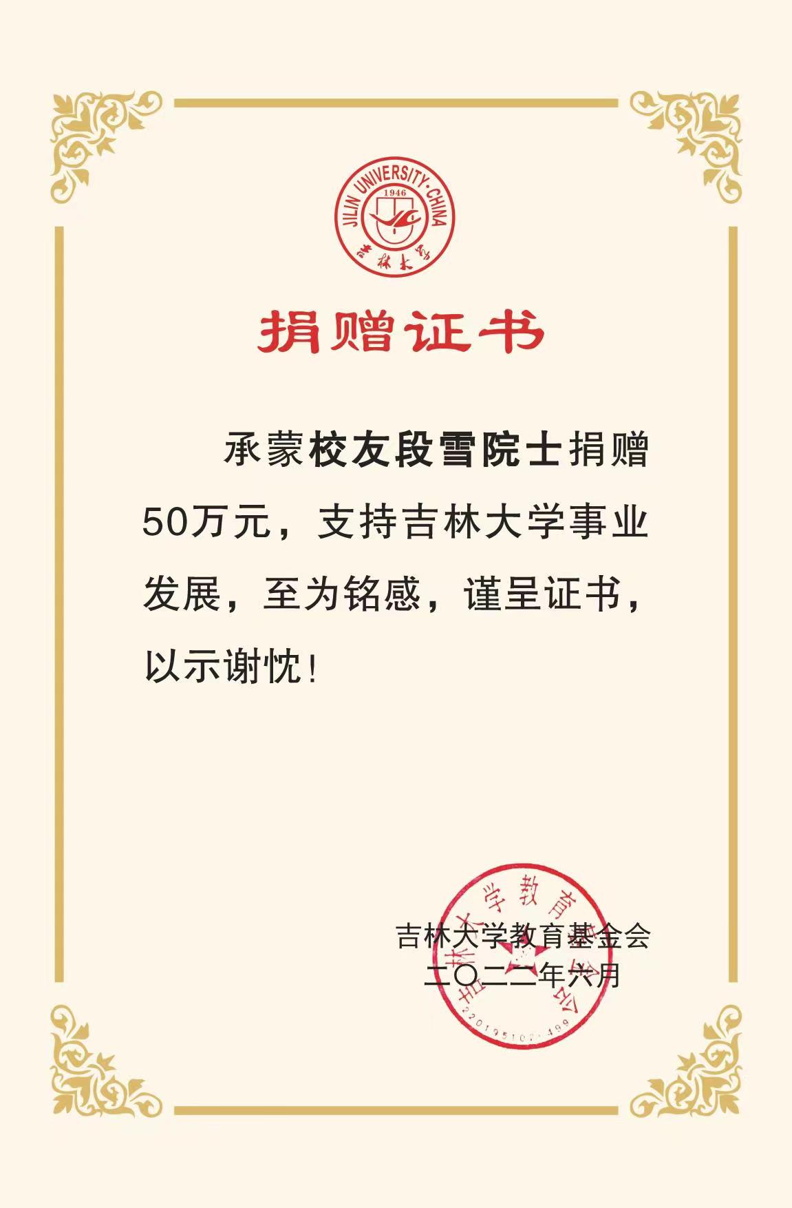 承蒙78级校友、中国科学院院士、北京化工大学段雪教授捐赠50万元,支持袋鼠影视 “关实之—陶慰孙奖学金”发展,至为铭感,谨呈证书,以示谢忱!