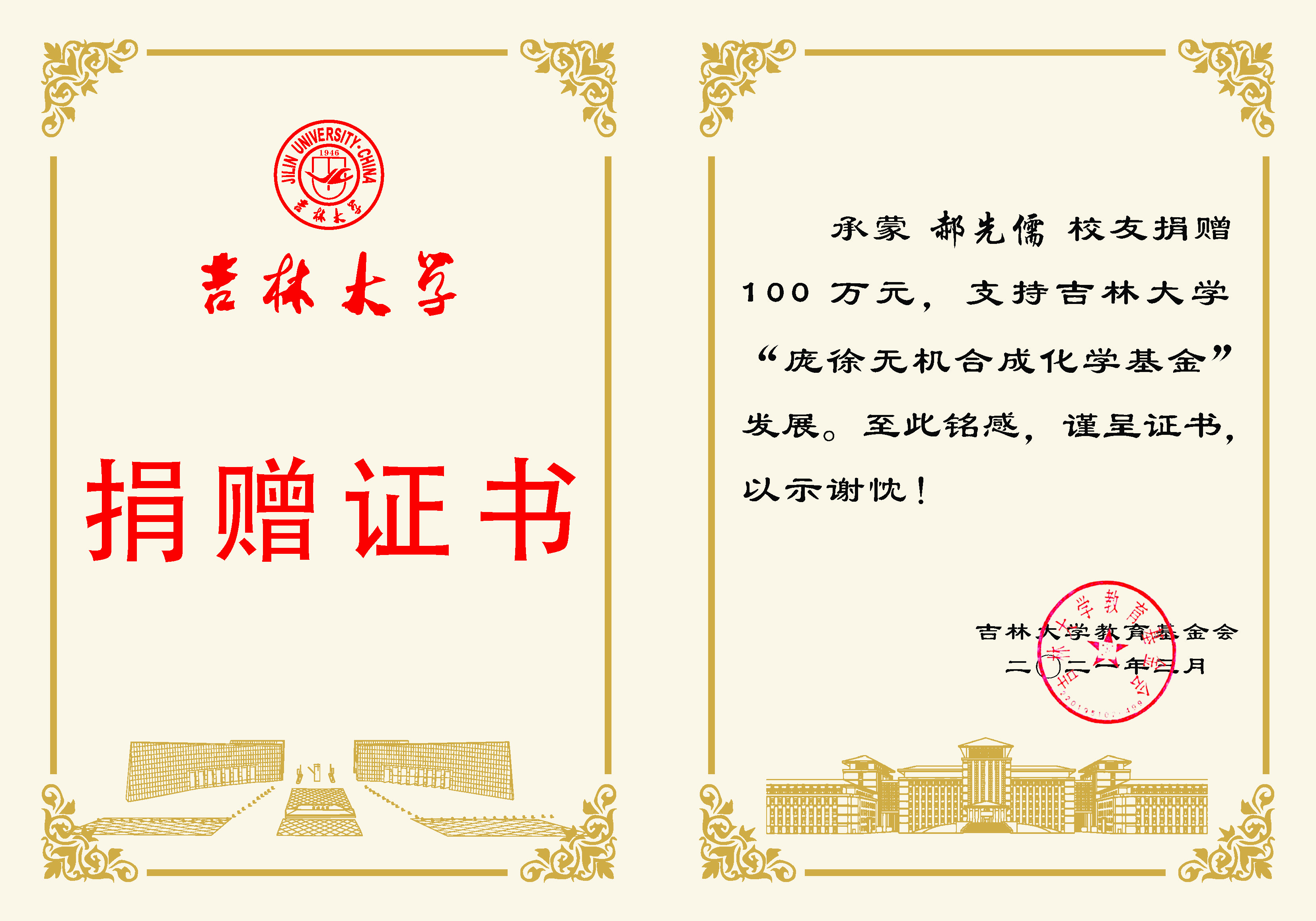 承蒙78级校友郝先儒先生捐赠100万元,支持袋鼠影视 “庞徐无机合成化学基金”发展,至为铭感,谨呈证书,以示谢忱!